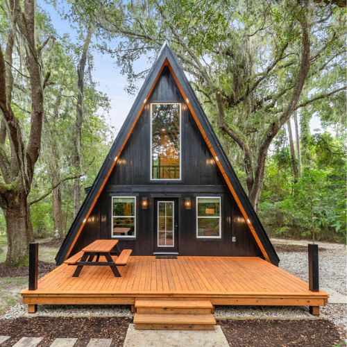 A-frame-inspired design delivers a striking exterior while enhancing structural stability, making the home a standout feature in any setting.